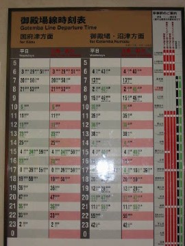 御殿場線時刻表。 平日ラッシュ時でも一時間に2,3本しか走りません。 これを見るとローカル線ムードが出てきます。 |