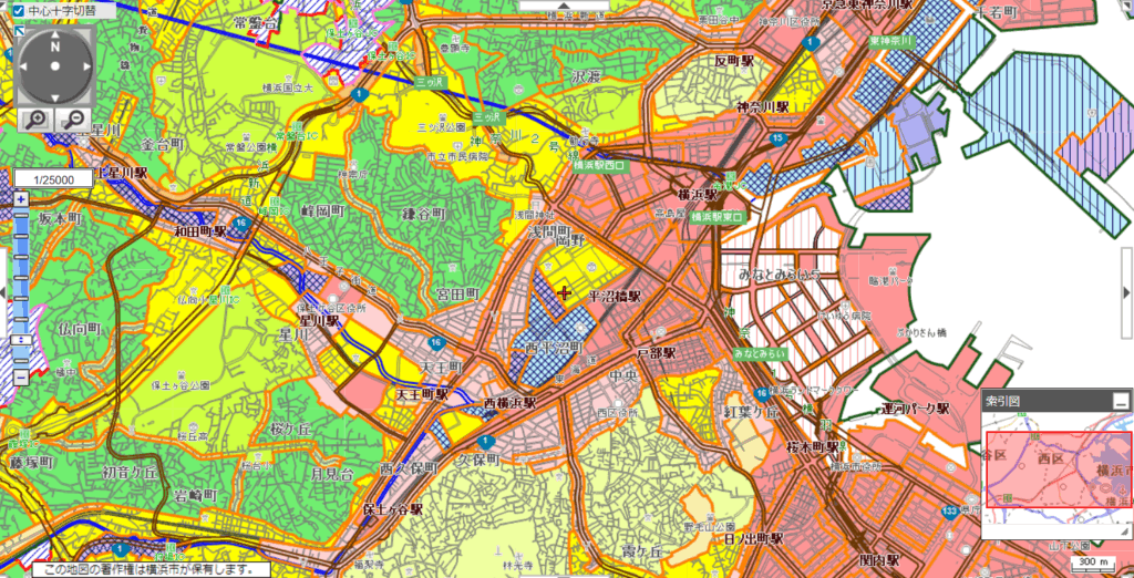 それで、用途地域のマップは自治体のサイトに載っているのだ。どこが商業地域とかがすぐわかる。ちなみに横浜市の中心部はこんな感じ↓(地図をクリックするとこの地図のページに飛びます)